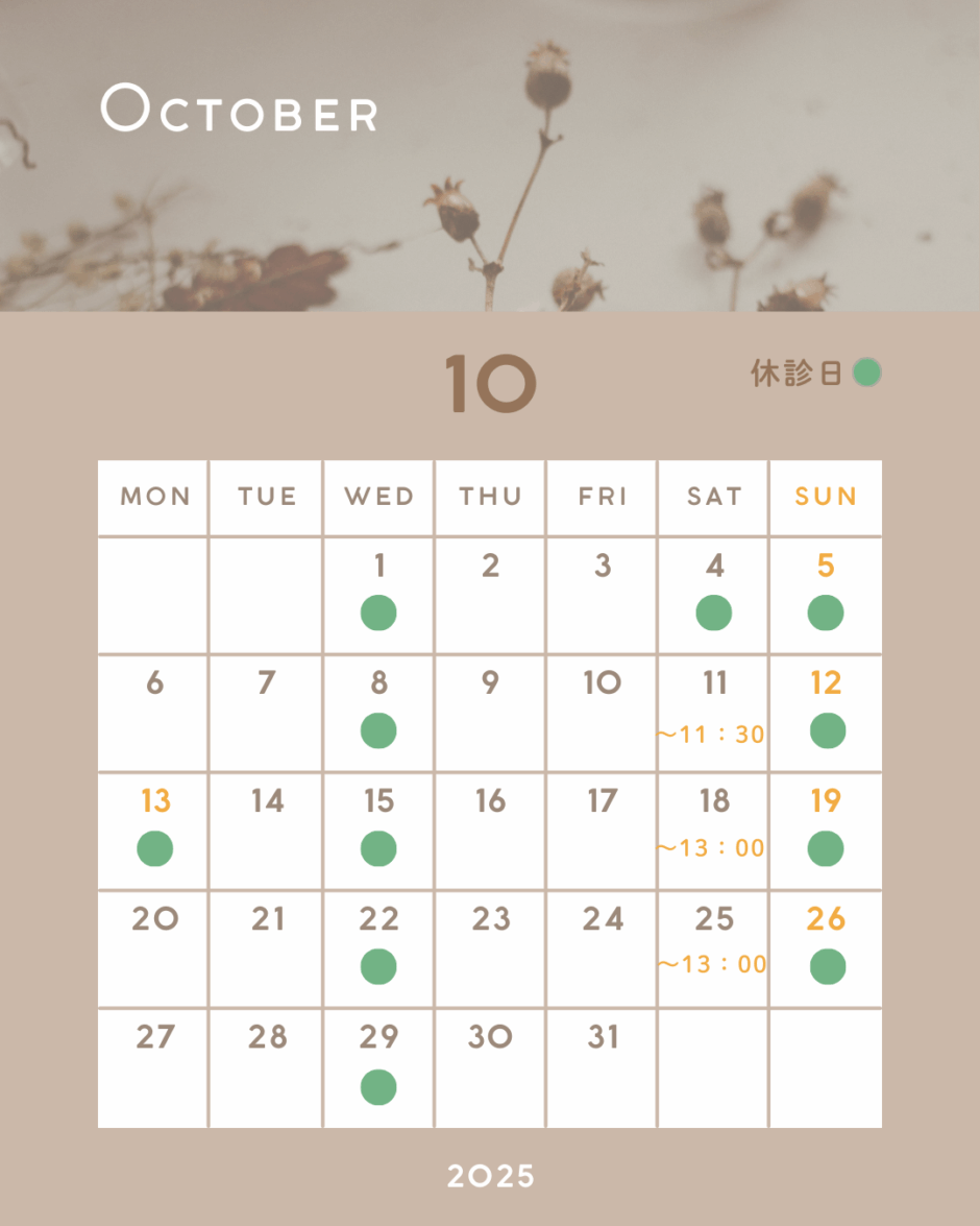 ホームお知らせ 10月の休診日・受付時間のお知らせ 2025年9月26日 SHARE ポスト シェア はてブ LINE 10月の休診日・受付時間の変更をお知らせいたします。 ◇ 10月 4日(土) 休診 ◇ 10月11日(土) 11:30 最終受付 ご不便をおかけしますが、よろしくお願いいたします。